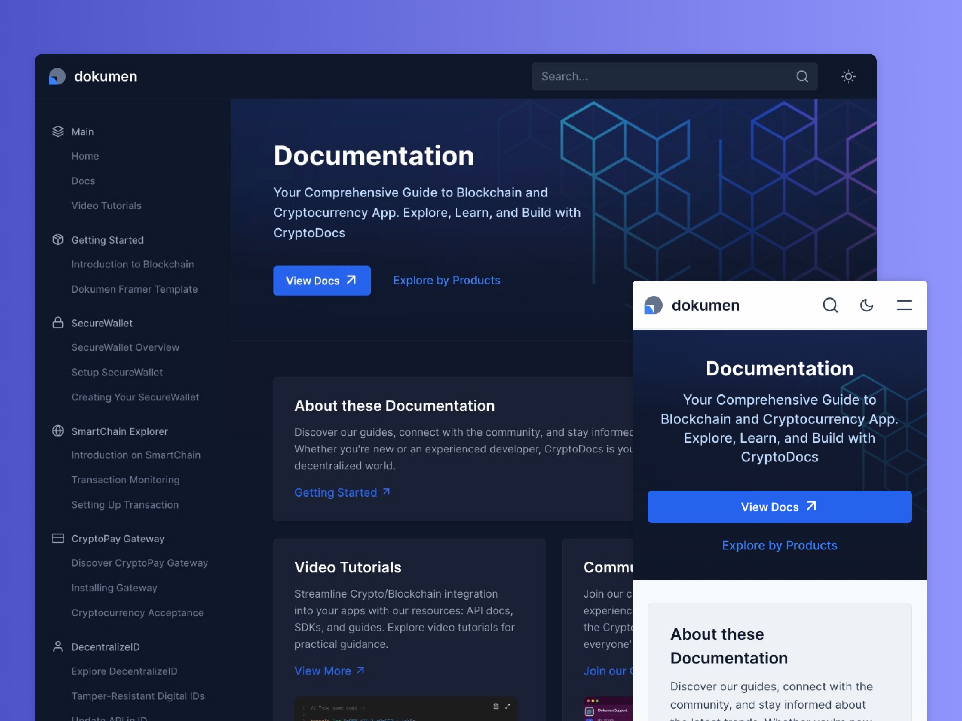 Dokumen Framer template: Simple yet sophisticated for visually appealing docs. Ideal for projects, instruction, and all your documentation needs. Essential pages include Home, Documentation Listing, Documentation (CMS), Contact, 404, Privacy Policy, and Sample static Docs page. Boasting a responsive design, it adapts to various devices and offers dark and light modes. Configuring Dokumen is straightforward, allowing easy customization to suit your requirements. Refund Policy: As this is a digital template, all sales are final. Please carefully review the product description and preview before making your purchase. We're committed to your satisfaction. If you have any questions or encounter any issues with the template, please contact us at [email protected] for assistance. Preview Link: https://dokumen.framer.website/ Important Note: Follow the link https://www.framer.com?via=zulazman and user promo code "partner25proyearly" for 3 months free yearly Pro annual subscription. Credits & Attributions: <a href="https://www.vecteezy.com/free-vector/blockchain-wallpaper">Blockchain Wallpaper Vectors by Vecteezy</a>